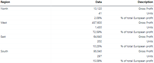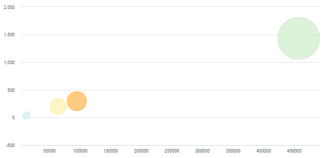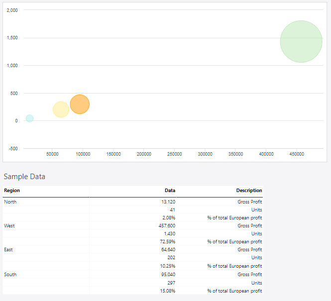 Every plotted data in a bubble chart requires three values: an x-axis, a y-axis, and a size. In the example below, the x-axis is the "Gross Profit," the y-axis is the number of Units, and the size of the bubble is, in this case, defined by "% of total Europe profit." Each region in the example represents a Series, and each Series consists of a single data point: