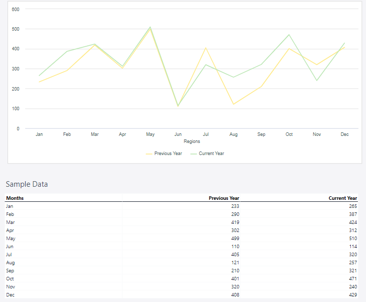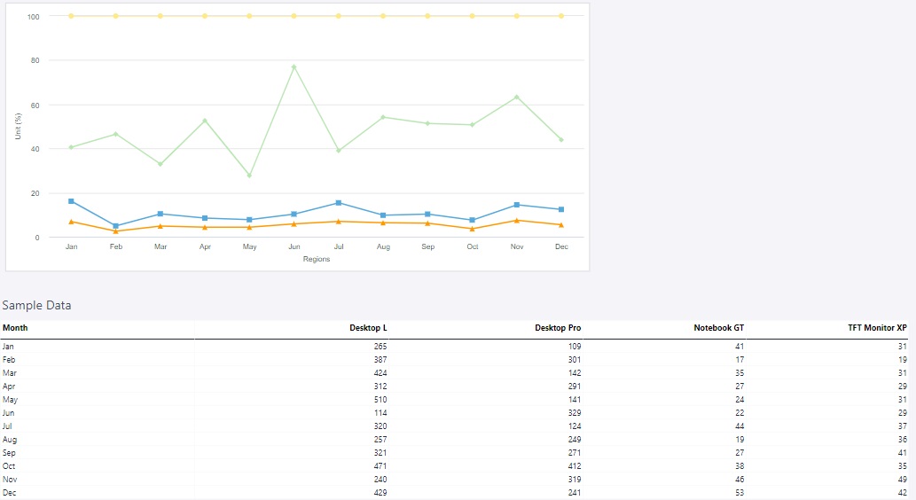 Line charts can be used for data that consists of time values. The time values usually cover the x-axis of the chart, and have to be valid date-time stamps. If daily time values are absent, it is possible to use other valid date-time stamps, such as the first day of every month. The time values should occupy the first column of the chart's data source.