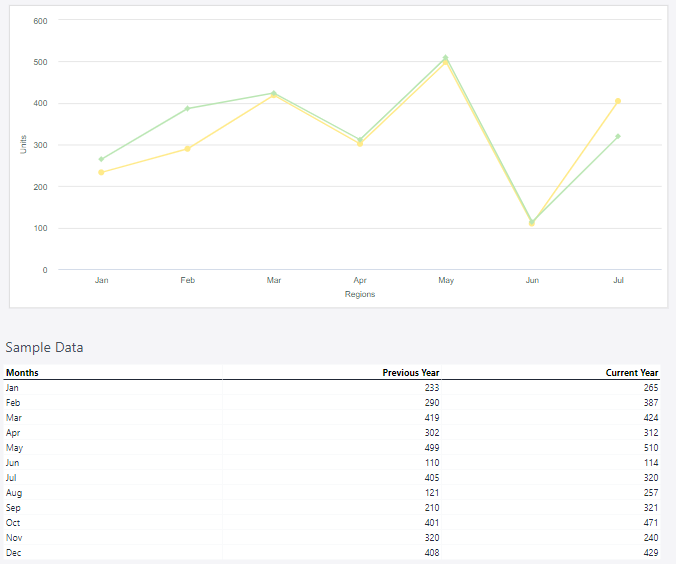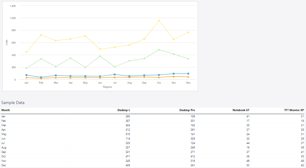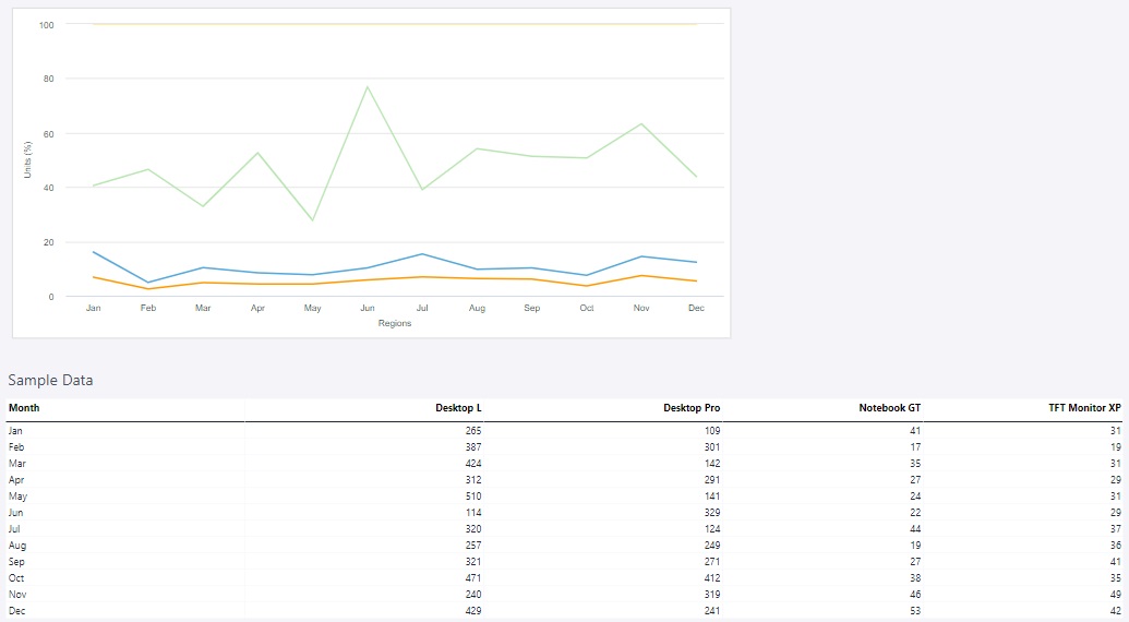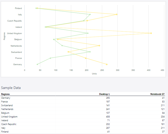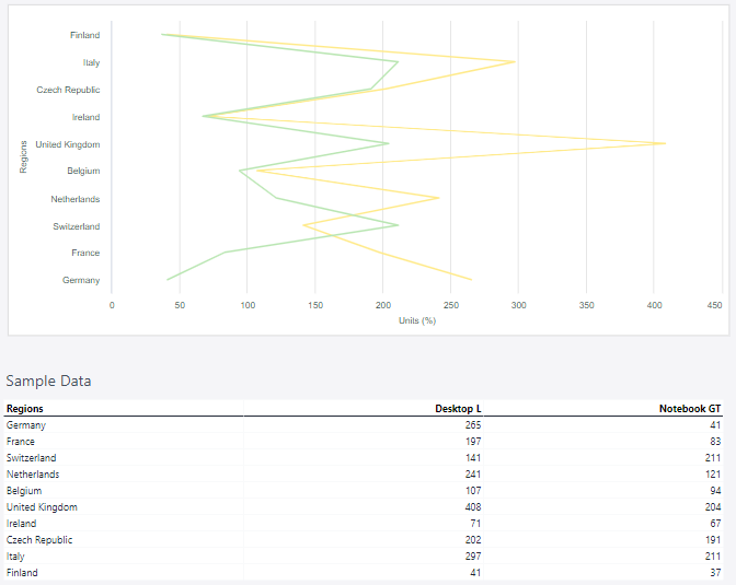 Using Units, the Rotated Line chart below shows the amount of products in various regions.