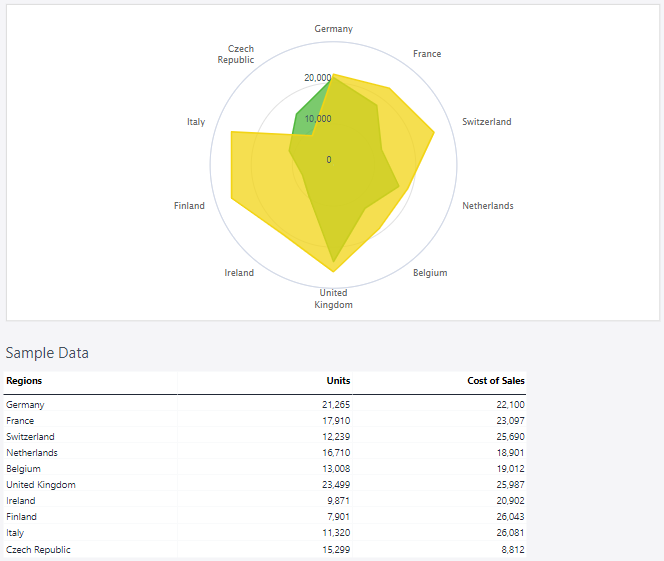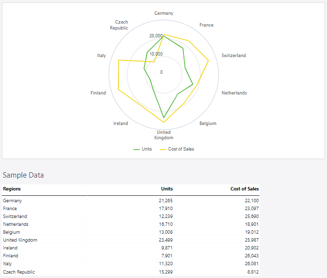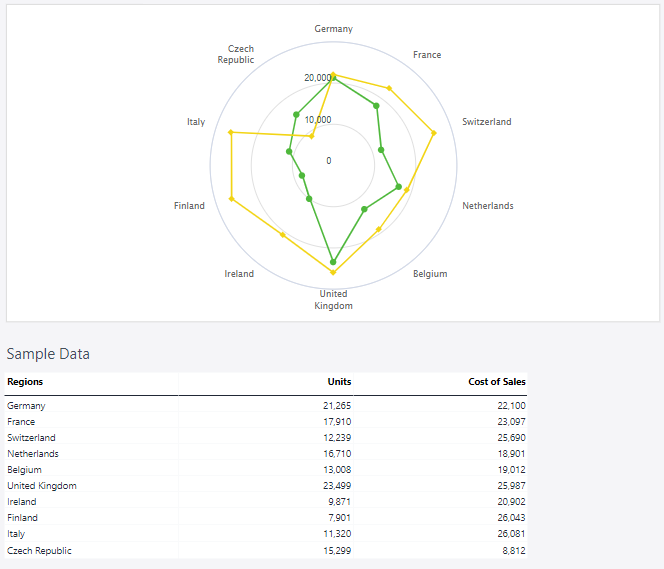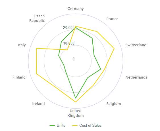 Using the Measures and Regions dimensions, the polar chart below shows the number of units and the costs of sales.